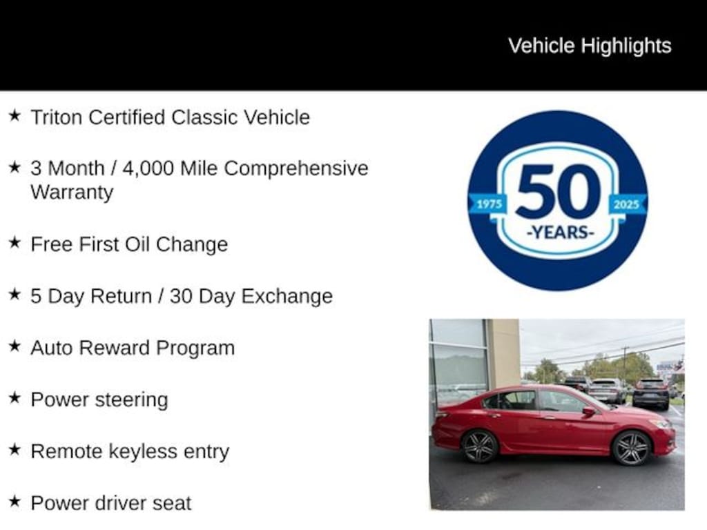Recent Arrival! 2016 Honda Accord Sport 2.4L I4 DOHC i-VTEC 16V CVT FWD 4D Sedan Red Triton Certified Classic Vehicle, 3 Month / 4,000 Mile Comprehensive Warranty, Free First Oil Change, 5 Day Return / 30 Day Exchange, Auto Reward Program, Black Cloth, ABS brakes, Brake assist, Electronic Stability Control, Exterior Parking Camera Rear, Power driver seat, Power steering, Power windows, Remote keyless entry, Steering wheel mounted audio controls.