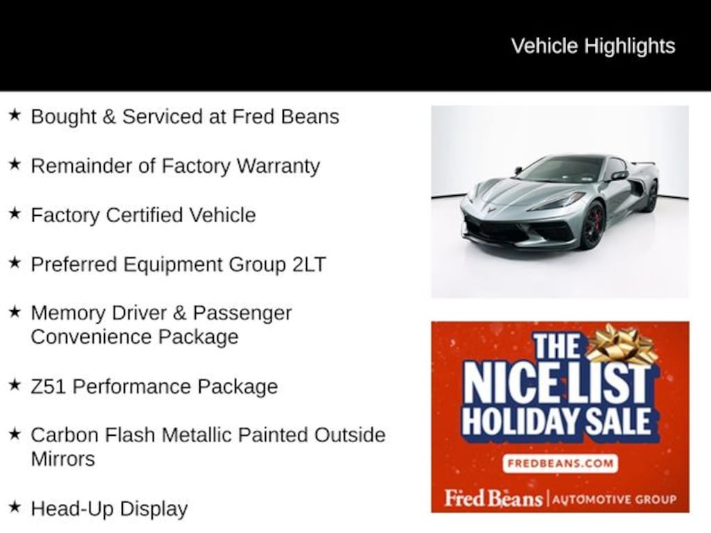 2022 Chevrolet Corvette Stingray 2LT 6.2L V8 8 Speed Dual Clutch RWD 2D Coupe Hypersonic Gray Metallic Bought & Serviced at Fred Beans, Remainder of Factory Warranty, Factory Certified Vehicle, 2 Cargo Nets, Carbon Flash Metallic Painted Outside Mirrors, Carbon Flash Metallic-Painted Outside Mirrors, Driver Power Bolster Seat Adjuster, Electrical Theft Deterrent System, Electronic Limited-Slip Differential, HD Front & Rear Vision Cameras, Head-Up Display, Heated & Vented Driver & Passenger Seats, Heated Steering Wheel, Heavy-Duty Cooling System, Memory Driver & Passenger Convenience Package, Passenger Power Bolster Seat Adjuster, Performance Data & Video Recorder, Performance Exhaust w/Stainless-Steel Tips, Performance Rear Axle Ratio, Power Driver Lumbar Control Seat Adjuster, Power Passenger Lumbar Control Seat Adjuster, Power-Adjustable Outside Heated Mirrors, Preferred Equipment Group 2LT, Rear Camera Mirror, Rear Cross Traffic Alert, Rear Park Assist, Rear Z51 Spoiler, Side Blind Zone Alert, Universal Home Remote, Vehicle Inclination Theft Deterrent Sensor, Vehicle Interior Movement Theft Deterrent Sensor, Wireless Charging for Devices, Z51 Performance Brakes, Z51 Performance Package, Z51 Performance Suspension.