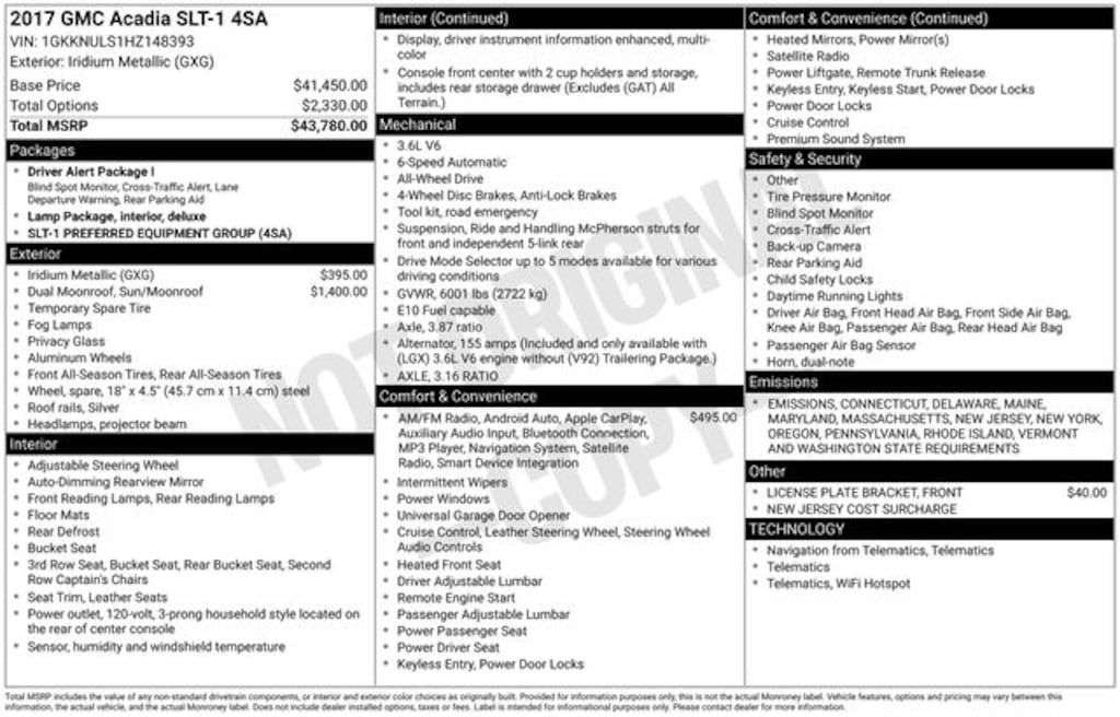 2017 GMC Acadia SLT-1 3.6L V6 SIDI DOHC VVT 6-Speed Automatic AWD 4D Sport Utility Iridium Metallic Local Trade, 3 Month / 4,000 Mile Comprehensive Warranty, Ford Blue Advantage Certified, 18" x 7.5" Aluminum (4) Wheels, 3rd row seats: split-bench, 6-Passenger (2-2-2 Seating Configuration), AM/FM radio: SiriusXM, Apple CarPlay/Android Auto, Automatic temperature control, Dual SkyScape 2-Panel Power Sunroof, Exterior Parking Camera Rear, Front dual zone A/C, Front fog lights, Garage door transmitter, Heated door mirrors, Heated front seats, Power door mirrors, Power driver seat, Power Liftgate, Power passenger seat, Power windows, Preferred Equipment Group 4SA, Radio: AM/FM 8" Diagonal Color Touch Navigation, Rear air conditioning, Rear window defroster, Rear window wiper, Remote keyless entry, SiriusXM Satellite Radio, Speed control.