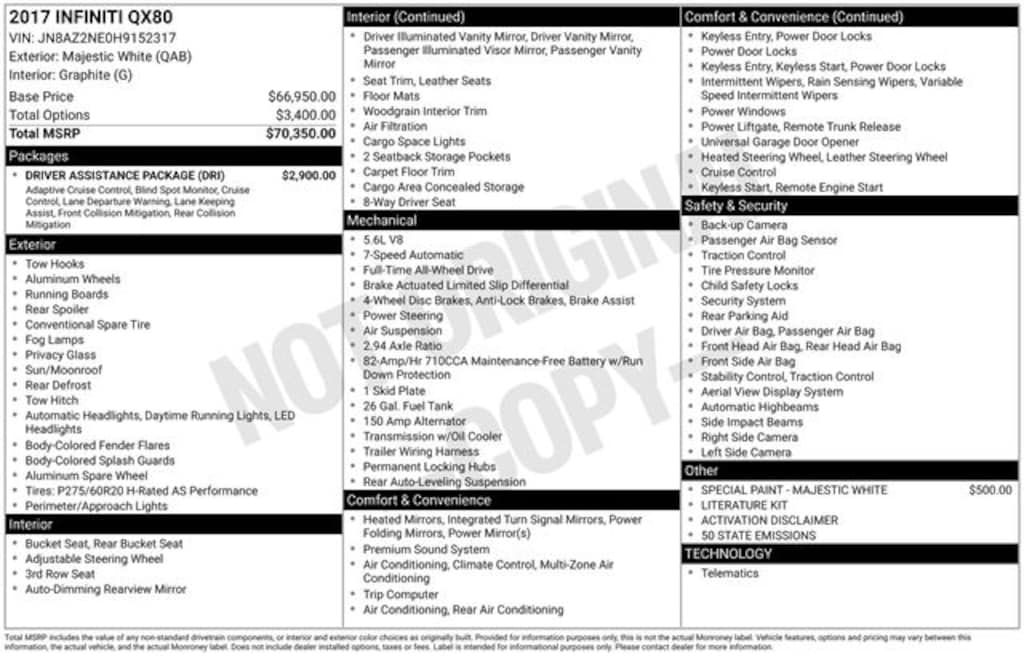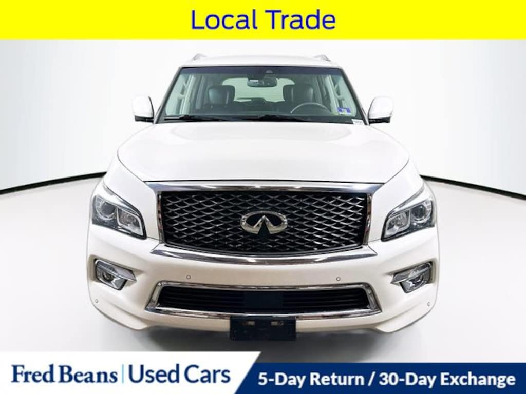 2017 INFINITI QX80 Base 5.6L V8 7-Speed Automatic 4WD 4D Sport Utility Majestic White Local Trade, 13 Speakers, 3rd row seats: split-bench, AM/FM radio: SiriusXM, Automatic temperature control, Backup Collision Intervention (BCI), Blind Spot Intervention (BSI), Blind Spot Warning, Driver Assistance Package, Front dual zone A/C, Front fog lights, Garage door transmitter: HomeLink, Heated door mirrors, Heated Front Bucket Seats, Heated steering wheel, Intelligent Cruise Control (Full-Speed Range), Lane Departure Warning System, Navigation System, Power door mirrors, Power Liftgate, Power moonroof, Power passenger seat, Rear air conditioning, Rear window defroster, Turn signal indicator mirrors, Wheels: 20" x 8.0" Split 6-Spoke Aluminum-Alloy.