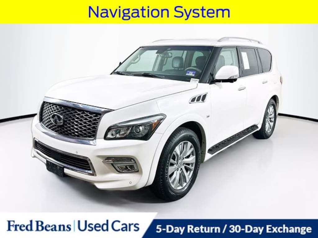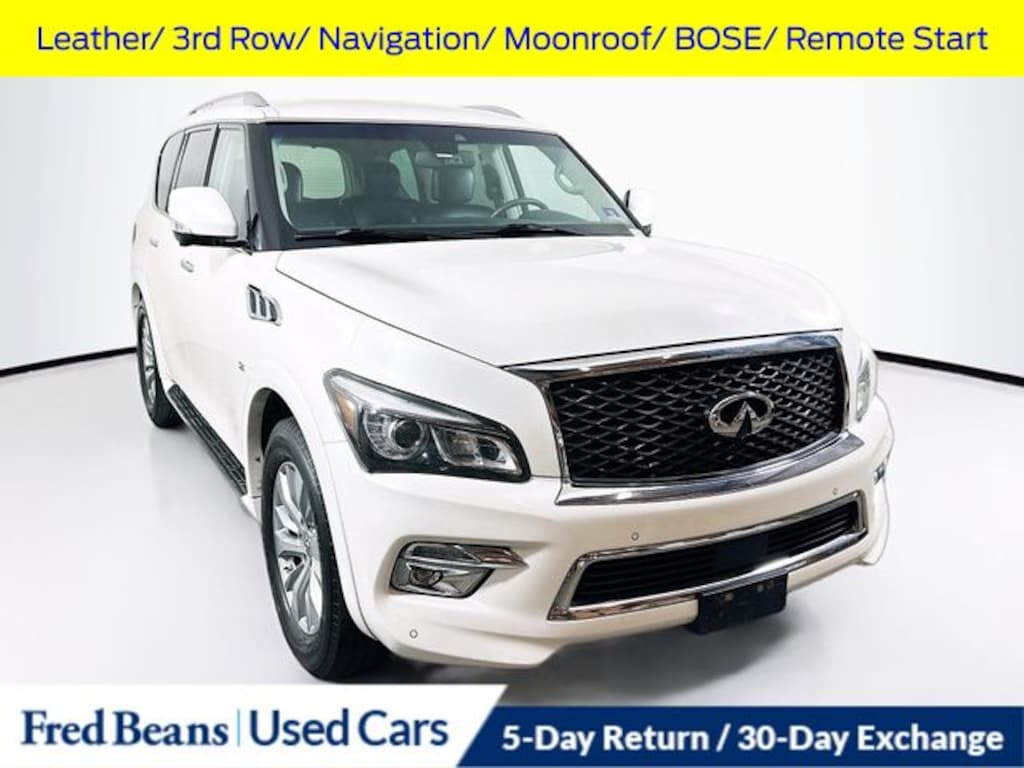 2017 INFINITI QX80 Base 5.6L V8 7-Speed Automatic 4WD 4D Sport Utility Majestic White Local Trade, 13 Speakers, 3rd row seats: split-bench, AM/FM radio: SiriusXM, Automatic temperature control, Backup Collision Intervention (BCI), Blind Spot Intervention (BSI), Blind Spot Warning, Driver Assistance Package, Front dual zone A/C, Front fog lights, Garage door transmitter: HomeLink, Heated door mirrors, Heated Front Bucket Seats, Heated steering wheel, Intelligent Cruise Control (Full-Speed Range), Lane Departure Warning System, Navigation System, Power door mirrors, Power Liftgate, Power moonroof, Power passenger seat, Rear air conditioning, Rear window defroster, Turn signal indicator mirrors, Wheels: 20" x 8.0" Split 6-Spoke Aluminum-Alloy.