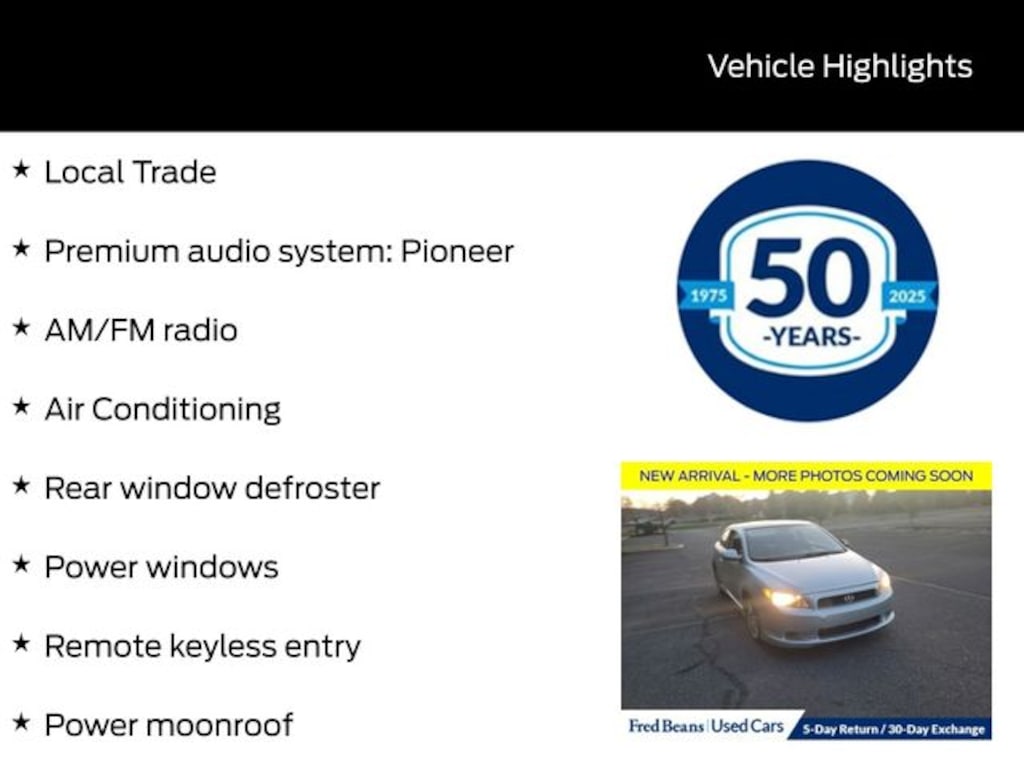 Recent Arrival! 2005 Scion tC Base 2.4L 4-Cylinder DOHC VVT-i 16V 4-Speed Automatic FWD 2D Coupe Silver Streak Mica Local Trade, Air Conditioning, Alloy wheels, AM/FM radio, Fabric Upholstery, Front Bucket Seats, Power door mirrors, Power moonroof, Power windows, Premium audio system: Pioneer, Rear window defroster, Remote keyless entry, Speed control, Tilt steering wheel. 23/30 City/Highway MPG