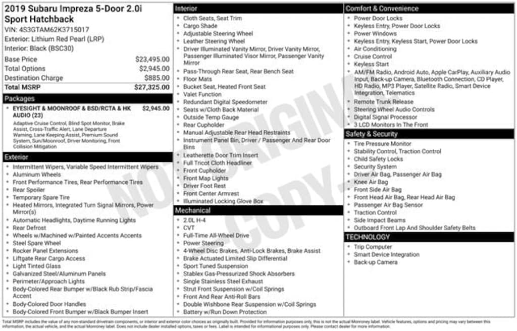 Recent Arrival! 2019 Subaru Impreza 2.0i Sport 2.0L DOHC CVT Lineartronic AWD 4D Hatchback Lithium Red Pearl Local Trade, 18" Alloy Wheels, AM/FM radio: SiriusXM, Blind Spot Detection (BSD), Exterior Parking Camera Rear, EyeSight & Moonroof & BSD/RCTA & HK Audio, EyeSight System, harman/kardon Amplifier & Speakers, Heated door mirrors, Heated Front Bucket Seats, Power door mirrors, Power Moonroof, Power windows, Rear Cross Traffic Alert (RCTA), Rear window defroster, Rear window wiper, Remote keyless entry, Speed control, Sport Fabric Upholstery, STARLINK/Apple CarPlay/Android Auto, Tilt steering wheel, Turn signal indicator mirrors. 27/35 City/Highway MPG